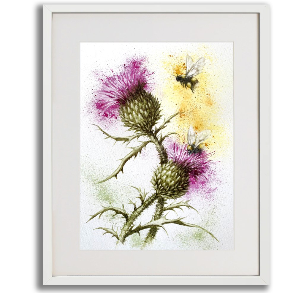 BEES AND THISTLES. Framed original watercolour. 32 x 42 cm SOLD